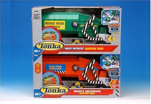 Reduce, reuse and recycle with the Tonka sanitation truck featuring hands-on controls to raise the dumpster up and over the cab. Motorized functions also operate the dumpster arm and tilt the dump bed for easy dumping. Push the buttons for sanitation truck lights and sound.
